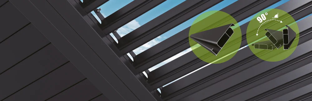 Pergola bioclimática de tamaño standard de estructura de aluminio de alta calidad con lamas superiores de doble capa y pilares en las esquinas. Existe modelo de pergola que se ancla a muro y se apoya en 2 pilares. Las lamas se pueden orientar para tener luz solar o sombra. Se pueden accionar de manera manual o motorizada. Pueden tener luz led y calefactores para invierno. Las Lamas de cubierta reciben el agua en caso de lluvia y derivan el agua a la canal perimetral, que luego lleva el agua a los pilares para evacuar por la parte inferior.